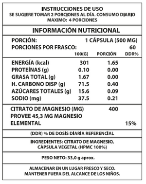 Concentración: 400 mg de Citrato de Magnesio puro por cada cápsula.