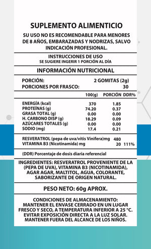 Descubre el secreto de la longevidad en un formato delicioso y práctico. Las Resveratrol Gummies de Vidanova son un potente concentrado de polifenoles extraídos de la pepa de uva (Vitis Vinifera). Este superantioxidante es conocido mundialmente por su capacidad para combatir los radicales libres y activar las "proteínas de la juventud", ayudando a proteger tu corazón, tu piel y tu cerebro del envejecimiento prematuro.